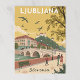 Ljubljana, featuring the iconic Triple Bridge, riverbank cafés, and Ljubljana Castle in the background. Add people walking, birds flying, and trees with graphic foliage. Use mellow yellows, olive greens, and salmon pinks for a nostalgic look. Text: “LJUBLJANA” at top in white caps, “SLOVENIA” in slim text below.