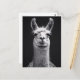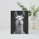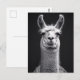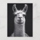 A striking monochrome llama portrait presenting a close-up view with intricate details of the fur, emphasizing a fascinating expression against a minimalist black backdrop.