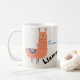Cute burnt orange colored llama with text: ”como te llamas?” . Background is beige with floating, fluffy hearts. All rights reserved. Art and design by Mira