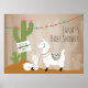 A baby shower poster featuring an illustration of a mama and baby llama standing near a cactus with "it's a girl" banner. Personalize the name. Matching baby shower invitations and coordinating items are available at Jill's Paperie.