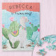 Personalized kids puzzle with adorable llama illustration. The template is set up for you to add the child's name, so the text reads "[name] is llamazing!". The puzzle has a watercolor illustration of an adorable fluffy white llama standing in a cactus garden. She is wearing a pink flower in her hair, tassels and traditional Peruvian saddle mat. Cute and charming design to entertain a llamazing child.