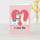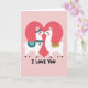 This greeting card shows two white, fluffy llamas facing each other with their eyes closed, gently touching noses as if sharing a kiss 💘. Behind them is a soft pink background with a large bright pink heart centered around their heads. The llama on the left wears a flower crown with teal, magenta, and yellow blooms, and it has a teal band around its neck with small tassels hanging down. The llama on the right has a patterned blanket on its back with orange, blue, and yellow shapes. Both llamas have a light blush on their cheeks, which makes the moment feel sweet and caring ❤️. At the bottom of the card, the words “I LOVE YOU” appear in black, thick capital letters that are easy to read. It’s a simple, loving design that’s great for romance or a close friendship 😘, and it’s a nice way to share your Valentine’s Day feelings with someone special.