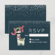 A Christmas RSVP with a whimsical design. A cute llama wearing black sunglasses, a red santa hat, and a festive winter scarf. Also wearing a south american styled blanket and pompoms on his neck. The word Joy written above his head in a festive colorful font. Snow falling down from the top. Set on a dark bluebackground.