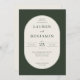 This elegant wedding invitation features a sophisticated and timeless design with an oval frame set against a dark green background. The typography is classic and refined, adding to the formal yet inviting atmosphere of the event. With its clean lines and simple color palette, this invitation exudes a sense of grace and understated luxury, perfect for couples looking to celebrate their special day in style. It’s ideal for those who appreciate traditional aesthetics while ensuring all essential details are clearly presented for guests.