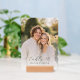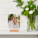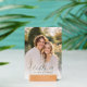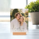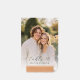 This elegant wedding table card features a soft, romantic photo design with a warm and inviting color palette. The typography is stylish and sophisticated, adding to the overall charm of the piece. Perfect for a serene garden or outdoor wedding setting, it exudes a joyful and intimate mood, ideal for celebrating special moments with loved ones. Customizable text allows you to personalize this beautiful keepsake for your big day.