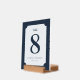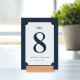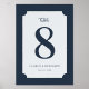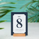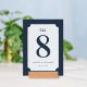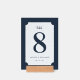 This elegant table card design features a sophisticated and timeless style, perfect for a wedding celebration. The large, bold number "8" takes center stage with clean typography, complemented by a simple yet refined script font above it. Set against a crisp white background framed in navy blue, the color palette exudes classic charm and understated elegance. Ideal for adding a touch of class to your reception decor, this design creates an inviting and polished atmosphere that enhances any special occasion.