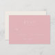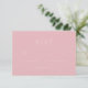 This elegant wedding RSVP card features a soft pink background with minimalist typography, creating an understated yet sophisticated look. The clean lines and simple design allow for easy customization of personal details while maintaining a timeless charm. Perfect for couples aiming to convey their love story in a refined manner, this card exudes warmth and grace, making it ideal for a romantic celebration. Its subtle color palette ensures it complements various wedding themes, offering versatility for any special occasion.