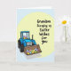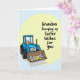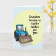 This greeting card features a stylized blue loader vehicle on the left, with an azure body and sturdy black wheels outlined in a simple cartoon style. Its large front scoop is heaped with pastel egg-shaped treats in soft pink, lavender, mint green, and sunny yellow, like a sweet surprise being delivered to someone special 🐰. A few more egg shapes peek through the windshield inside the cabin, adding a cozy, sharing-from-the-front-seat feel, as if two friends are in on the same little secret. Behind the vehicle, a two-tone background blends a pale yellow arc across the lower and right areas into a light blue corner at the top left, keeping the scene airy and bright. On the right side, a hand-drawn message in black cursive lettering sits prominently against the open background, balancing the heavy machine with a gentle note. The overall layout leaves plenty of breathing room, with the vehicle anchoring the left and the text acting as a quiet reply on the right, like a friendly back-and-forth. Small spring touches are suggested through the candy-like colors and the sunny backdrop 🌷. The scoop’s curved edge and the rounded eggs are drawn with thick black lines that make each shape stand out clearly.