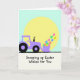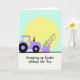 This greeting card shows a lavender heavy-duty vehicle parked in the lower-left area, its chunky black tires and big front scoop angled as if it’s gently tipping a gift forward. From the scoop, speckled egg shapes tumble out in soft pink, light blue, leafy green, and warm yellow, and the way they spill together feels like a sweet shared moment between friends 🐰. A large sunny yellow circle sits high in the background like a glowing sun, casting a cozy, affectionate mood over the scene. The sky behind it is a pale aqua, keeping the focus on the pastel eggs as they scatter across the creamy ground. Near the bottom, a short Easter greeting is hand-lettered in dark charcoal, centered low on the page so it reads just beneath the rolling eggs 🌷. The text sits on open space with plenty of breathing room, making the message easy to spot without crowding the illustration. Flat color areas and crisp outlines keep everything graphic and simple, from the truck’s smooth panels to the dotted patterns on each egg. The bottom section shows the charcoal lettering resting above the cream-colored base while the pastel eggs fan out to the right.