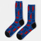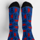 Dark blue patterned socks for men or women with lobster and crabs design. Dark blue lobsters and red crabs crawl over a royal blue background color. Toes and heels are black. Makes a fun gift for any shellfish lover, seafood cook, or seafaring man.