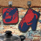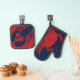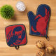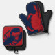 Kitchen mitt and pot holder set with big lobster and crab designs. Perfect for the seafood lover, or chef, the items contain opposite coloring with a red crab over dark navy blue on the oven mitt. A dark blue lobster image is over a dark red background on the pot holder.
