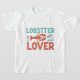 The t-shirt design features the text "Lobster Lover" in a playful, handwritten font, surrounded by colorful, whimsical lobster-themed illustrations like bubbles, seaweed, and seashells. The overall design conveys a sense of fun and joy, celebrating the love of lobster and the ocean.
