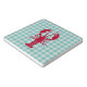 Fun trivet that goes with all sorts of coastal and summer decor themes! Design features red lobster silhouette on blue gingham background