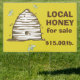 A bright and eye-catching sign for anyone who sells fresh local honey decorated with a bee skep and honey bees hand drawn with ink and watercolor on a honey yellow background with brown text. You can edit the text to fit your needs. Great way to advertise your honey for sale!