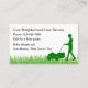 Simple lawn service business card template created with a lawn mowing pro silhouette and green grass along with a simple layout for a local neighborhood service. Customize the design online for any lawn care service, landscaping service, or grounds maintenance.