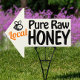 Bold typography yard sign reading "local Pure raw Honey" with arrow and cute bee