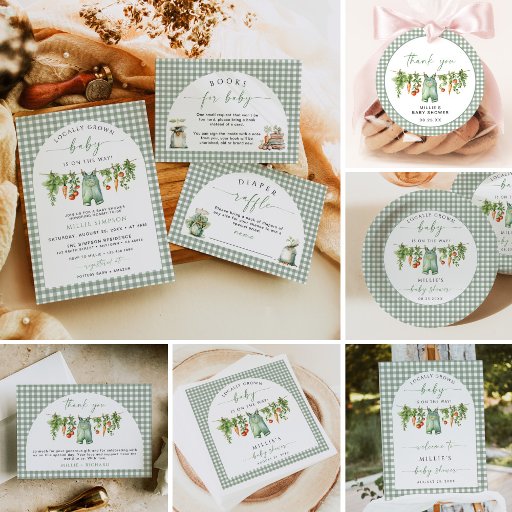 Cute locally grown themed Hershey Kisses make a lovely favor at your baby shower. The labels have a watercolor clothes line graphic, a sage green gingham background and a modern font. Pair with anything in the MILLIE collection for a cohesive look.