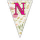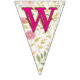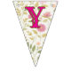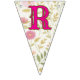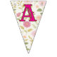 Locally grown banner bunting flags. Sixteen triangle shaped flags each have a light pink and green floral pattern as the background for bright pink lettering. Four flags have no letters and the others are templates. Use for a farm stand or baby shower for a girl. This design will also fit on the swallowtail flags.
