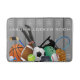 Locker Room Design Bath Mat, featuring a pile of various sports' equipment in front of a set of lockers, with customizable text. For no text, delete sample text and leave blank.