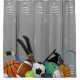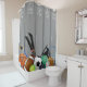 Locker Room Design Shower Curtain, featuring a pile of sports equipment in front of a set of lockers.
