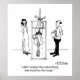 A man in handcuffs hangs upside down in a tank of water says, "I didn't realize the locksmithing test would be this tough."