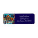 Personalized Christmas log cabin return address labels. A beautiful illuminated log cabin on Christmas Eve with Christmas lights and snow topped trees.