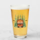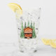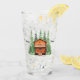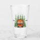A redwood or cedar log cabin is surrounded by tall evergreen trees, making this the perfect glass for your vacation cabin or camp.