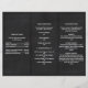 Use this tri-fold price list brochure template in faux black chalkboard to design your own menu of goods and services to market your business to prospective customers. The simple black and white blackboard layout includes two picture image templates for uploading your logo, or a photo if you prefer, to perfectly promote your business. Text templates on both sides of this trifold brochure in a classic white font on the rustic faux chalkboard background with thin black borders makes it easy to customize this price list design exactly how you want it. The beauty of this simple design is you can personalize depending on your business. If you own a restaurant or bar, you can create a pamphlet price list menu with your company logo for use on site and to tuck into take out order bags. The versatile layout is perfect for service companies who will use this price brochure template to advertise goods and services, with prices, anywhere from in-house to leaving with customers during estimate meetings or to advertise during trade shows. ***NOTE: THESE PRICE LIST BROCHURES DO NOT SHIP PRE-FOLDED. You will need to fold these faux chalkboard brochures yourself, but as every small business knows, that's what friends and family are for!
