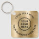 Simple promotional keychain for your business or organization on a brushed gold faux metallic background. Add your logo or QR code and two lines of customized text, such as your company name, slogan, thank you, or leave blank.