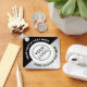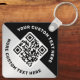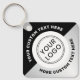 Double sided keychain with your custom logo on a white, round background surrounded by circular text on the front and QR code on the back. Black and light gray gradient background. Change fonts and font colors, move and resize elements with the design tool.