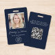 Professional blue ID badge featuring your employee's photo, their name in a chic white script and their title in simple white lettering, and your business or organization's logo. On the back, add additional information and optional QR code.