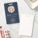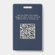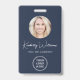 Professional blue ID badge featuring your employee's photo in a circle frame, their name in a chic white script, their title in clean white lettering, and your business or organization's logo. On the back, add any additional information and an optional QR code. The QR code is automatically generated by Zazzle from the website address you provide.