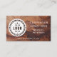 Logo QR Code Modern Wooden Carpentry Construction Stylish Business Cards features a stylish wooden furniture pattern with an overlay of your name, company or designation, contact details, social media, logo and add your custom QR code on the reverse. Perfect for marketing your small business. Personalize by editing the text in the text box provided. Designed by ©Evco Studio www.zazzle.com/store/evcostudio