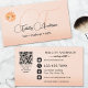 Elegant business card featuring your own logo (if you replace the sun image) on an elegant peach pink background design. On the back is a QR code template as well as an optional row of media icons. A great business card for a beauty salon or other professionals in the beauty or event organizing business.