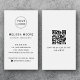 Vertical, white or any color business cards with customizable template fields for your custom logo (photo or other graphic), QR code, name, title/company name, contact information and social media on the front. You can change fonts, font and background colors with the design tool.