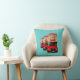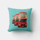 Cushion (throw pillow) in a jade color illustrated with a montage of three London buses. On the reverse is a single image of the London bus from times gone by.