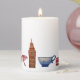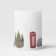 A stylish candle with iconic London scenes including the Elizabeth Tower (Big Ben), St. Paul's Cathedral, and the ever-iconic red telephone booth.
