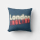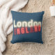 Modern typographic design features "London England" in red and white neon text on dark blue background