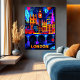Experience London's electric vibe in this striking geometric illustration, featuring iconic landmarks like Big Ben, the vibrant city skyline, and the unmistakable red double-decker buses. Illuminated by bold neon colors and dramatic contrasts, this artwork perfectly captures the city's lively atmosphere and timeless charm. Ideal as a centerpiece for lovers of urban style, travel enthusiasts, and modern interior spaces.