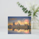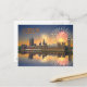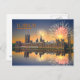 London postcard with an image of firework celebrations over the Houses of Parliament being reflected in the River Thames