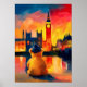 Vibrant London teddy beanie artwork featuring a contemplative teddy bear silhouette by the Thames river at sunset. Bold fauvist skyline, Elizabeth Tower geometry, and crisp segmented reflections create striking wall art perfect for london lovers, nursery decor, and modern interiors.
