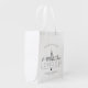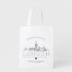 A unique wedding bag for a wedding taking place in the beautiful city of London. This bag features a stylized illustration of the city's unique skyline with its name underneath. This is followed by your wedding day information in a matching minimal open lined style.