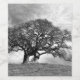 A black and white photograph of an impressive oak tree with room for text to personalize your label.