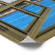 This design features a faux brown wooden 6 pane window frame overlooking the scenic Long Beach Harbor. This product is trompe l'oeil style art and is designed to have a window "appearance". No wood frame is included.