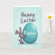 This card shows a stylized long-eared bunny in soft gray, with pink inner ears, a rosy nose, and a fluffy white tail, smiling as it cuddles a large teal egg 🐰. The bunny’s arms wrap around the egg in a snug hug that reads like a sweet friendship moment, as if it doesn’t want to let go. Centered on the egg is a short message in white lettering, sized to fill the middle without touching the edges. Near the top, the words “Happy Easter” appear in dark lettering, arched slightly and spaced so they stand out against the sky-toned background. The setting is a gentle light-blue gradient with scattered white dots that resemble confetti or spring pollen 🌷. The composition keeps the bunny and egg centered, with plenty of open space around them so the text stays easy to read. A few of the white dots cluster more densely near the upper corners, while the teal egg sits smooth and glossy beneath the bunny’s chin.