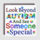 Inspirational quote of “Look Beyond AUTISM And See Someone Special” with colorful Autism puzzles to support autistic children and their families.