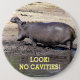 BUTTON FEATURING PHOTO OF HIPPO WITH MOUTH WIDE OPEN AND THE TEXT: "LOOK--NO CAVITIES!" GREAT FOR DENTISTS AND PARENTS TO HAND OUT TO THEIR YOUNG PATIENTS OR CHILDREN.