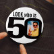 Celebrate a 50th Birthday with this fun look who is 50 photo badge/button. Personalise this age badge with a photograph of the birthday boy or girl. Great idea for adding some fun to a birthday party. Can be used to show baby photos or other fun or embarrassing photos over your birthday girls or boys fiftieth years. Exclusive design by Sarah Trett.