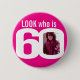 60th birthday fun photo hot pink with white text look who is 60 pin badge button. Personalize this age badge with a photograph of the birthday girl. A great idea for adding some fun to a sixtieth birthday party. It can also be used by purchasing several pins to show baby photos or other fun or embarrassing photos over your birthday girls sixty years for everyone to choose and wear. Other matching items and colors are available. Exclusive design by Sarah Trett for www.mylittleeden.com