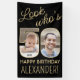 Look who's 50! Celebrate a happy 50th birthday for him or her with a custom 2 photo vertical banner. Pictures and wording on this template are simple to personalize. (IMAGE PLACEMENT TIP: An easy way to position a photo exactly how you want is to crop it before uploading to the Zazzle website. If you need additional help, please message me :) The black and gold design features two pictures of your choice, elegant modern script calligraphy, and classic vintage art deco typography. Please note that gold is printed color, not metallic foil. This special fortieth birthday sign adds a customized finishing touch to party decorations and is a stylish way to welcome guests to the celebration. The gender neutral design is suitable for either a man or a woman. Happy Fiftieth birthday!